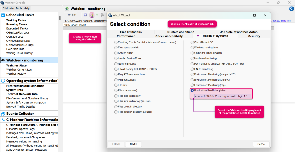 Začnite pridaním nového Watchu pomocou sprievodcu (wizard) pri Premium licencii. Potom sa prekliknite na záložku „Health of Systems“ a vyberte si z preddefinovaných šablón verziu vášho VMware pluginu.