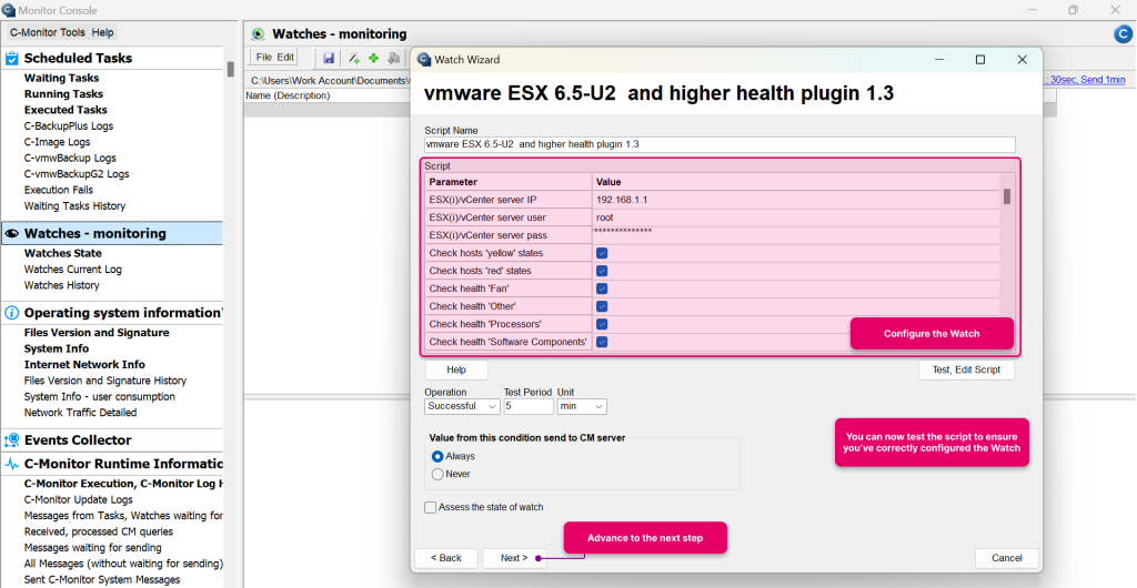 Otvorí sa okno, v ktorom nakonfigurujete váš monitoring. Je potrebné nastaviť IP adresu servera a prihlasovacie údaje. Následne otestujte, či je Watch správne nakonfigurovaný pomocou tlačidla „Test, Edit Script“ a stlačením zelenej šípky na spustenie skriptu.