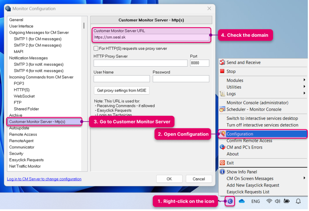 Konfiguráciu C-Monitora otvoríte cez Tray menu C-Monitora. Adresu CM Servera nájdete v záložke Customer Monitor Server – http(s).